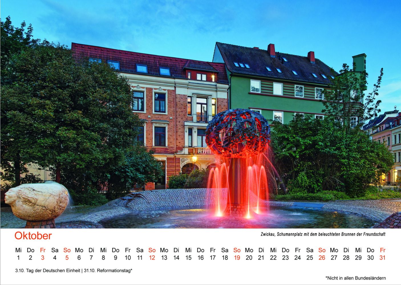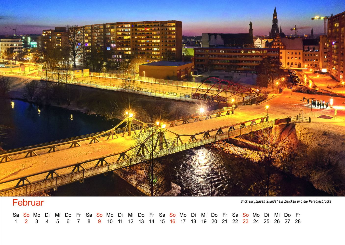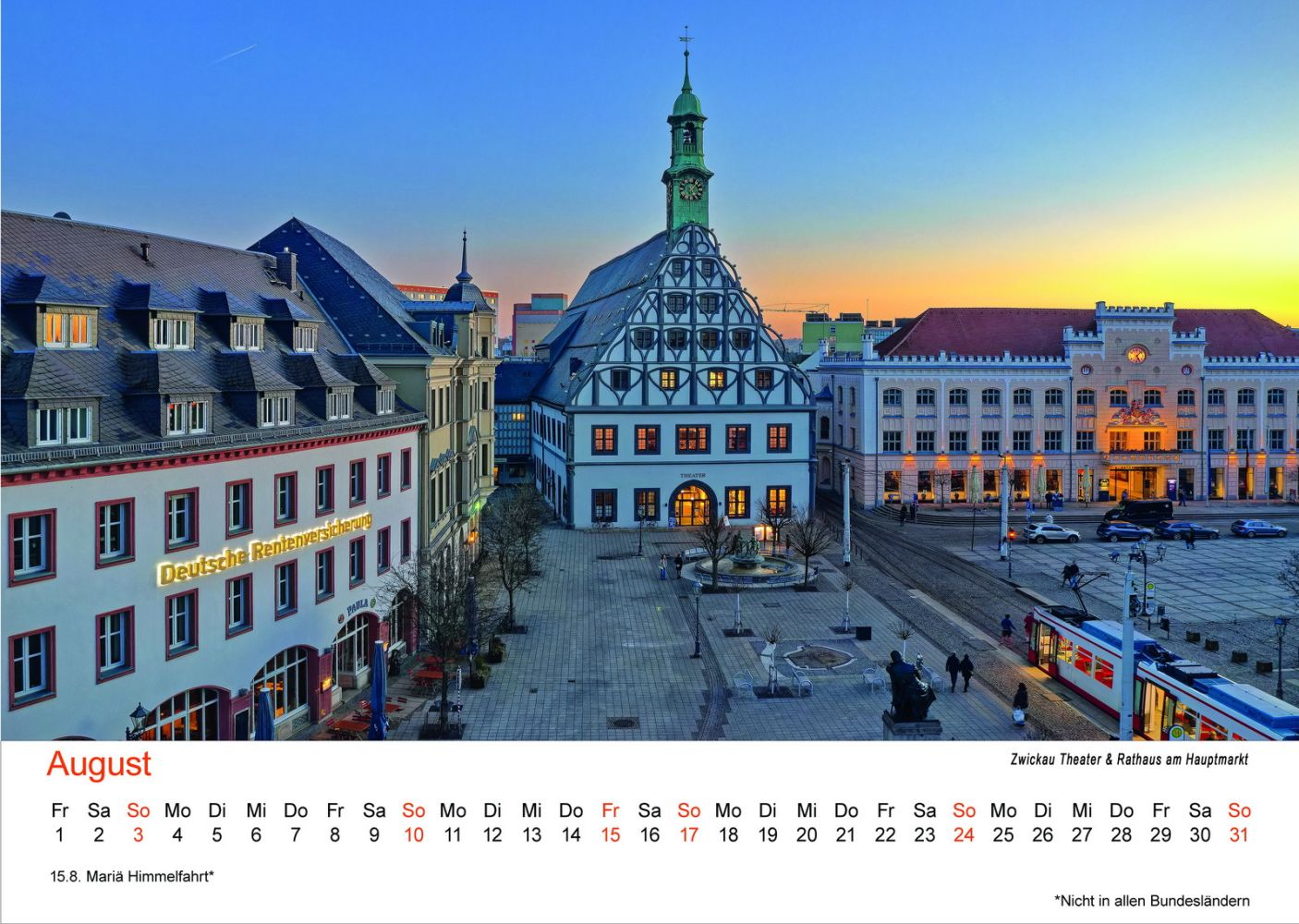 Wie jedes Jahr enthält der Zwickau-Kalender wieder sowohl klassische Motive als auch Aufnahmen aus der Vogelperspektive. Wie immer auch aus kaum möglich geglaubten Perspektiven und in unterschiedlichen Lichtstimmungen - immer den Blick auf die Schönheit unserer Stadt und unserer Dörfer im Landkreis!